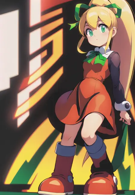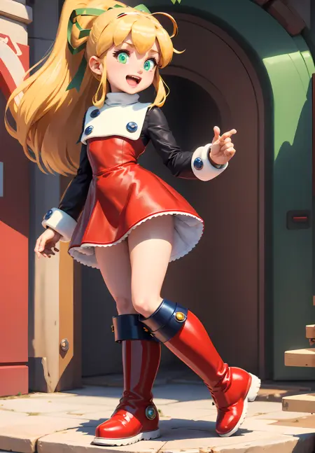 [ megamanroll, 1girl, ((solo)), green eyes, blonde hair, ponytail, ribbon, boots, dress, long hair, red dress, hair ribbon, long sleeves, red skirt, green ribbon, sidelocks, skirt, boots ]
