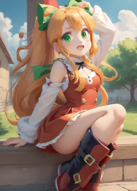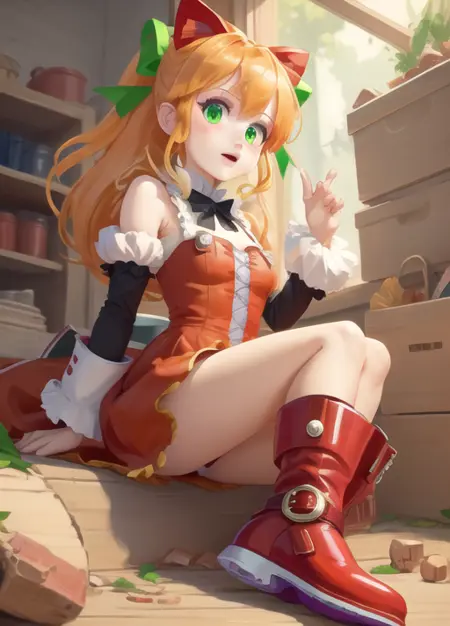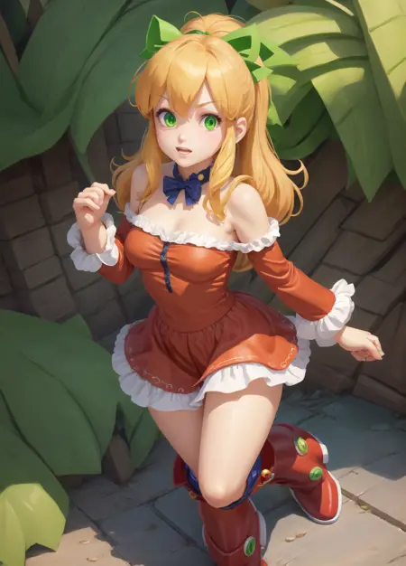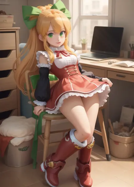 [ megamanroll, 1girl, ((solo)), green eyes, blonde hair, ponytail, ribbon, boots, dress, long hair, red dress, hair ribbon, long sleeves, red skirt, green ribbon, sidelocks, skirt, boots ]