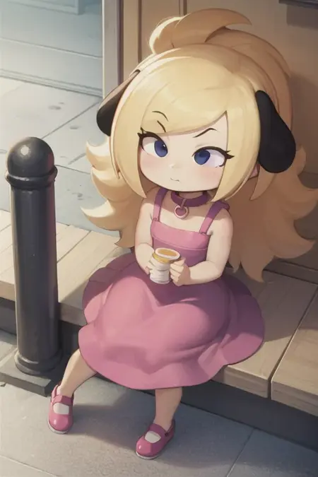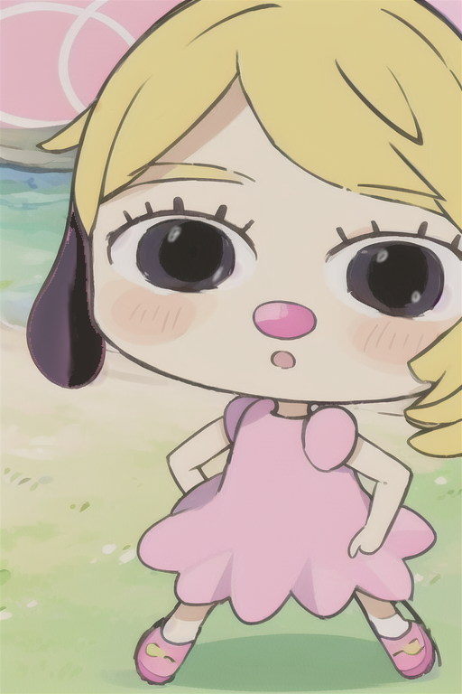 , 1girl, pastel color, yellow hair, pink dress, pink curly top yellow hair pink shoes pink nose dog ears