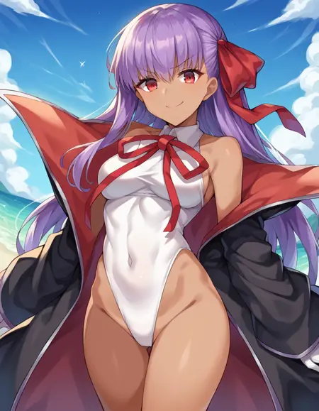 red eyes, bare shoulders, black coat, coat, covered navel, dark skin, dark-skinned female, gloves, hair ribbon, highleg, highleg leotard, leotard, neck ribbon, open clothes, open coat, popped collar, red ribbon, ribbon, tan, white gloves, white leotard,