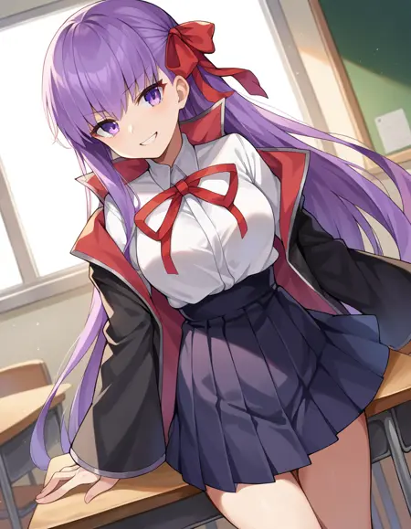 purple eyes, black jacket, black skirt, collared shirt, hair ribbon, high-waist skirt, jacket, long sleeves, neck ribbon, open clothes, open jacket, pleated skirt, red ribbon, ribbon, shirt, skirt, sleeves past wrists, white shirt, wide sleeves,