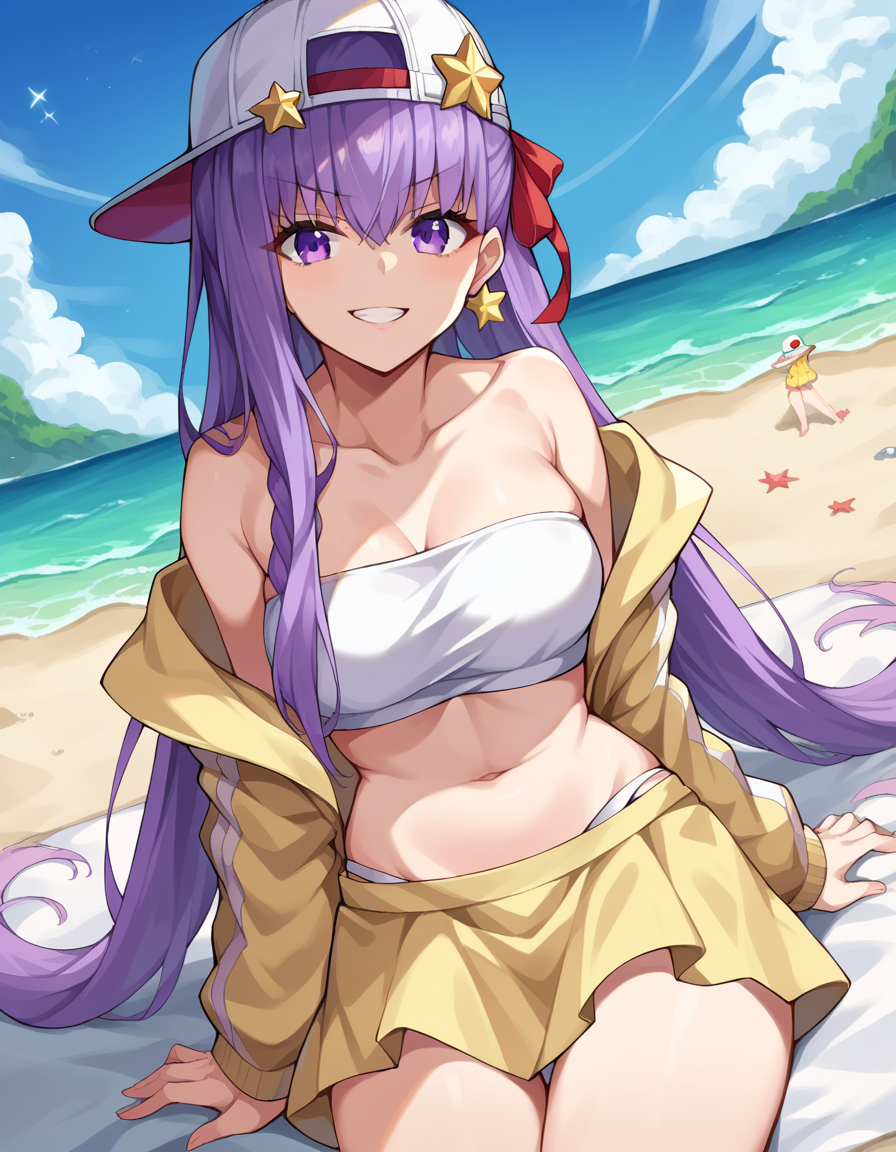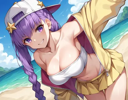 purple eyes, backwards hat, bandeau, bare shoulders, baseball cap, braid, collarbone, hat, hat ornament, jacket, navel, off shoulder, single braid, star \(symbol\), star hat ornament, white headwear, yellow jacket, yellow skirt, bikini, white bikini,