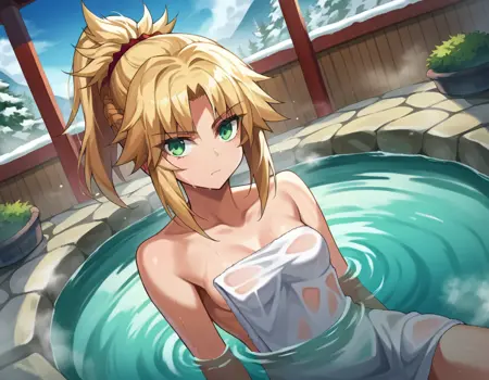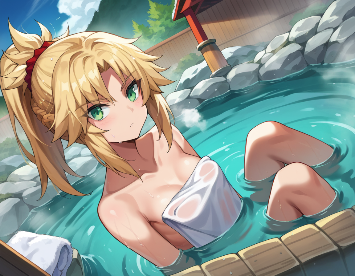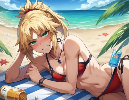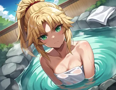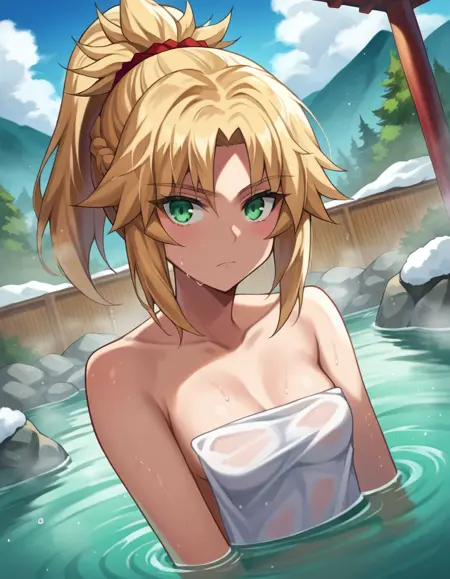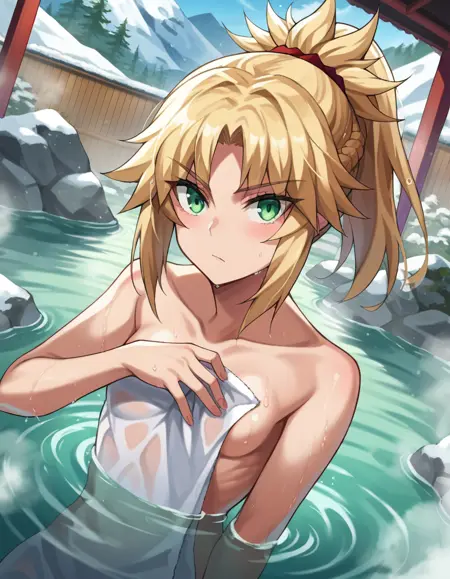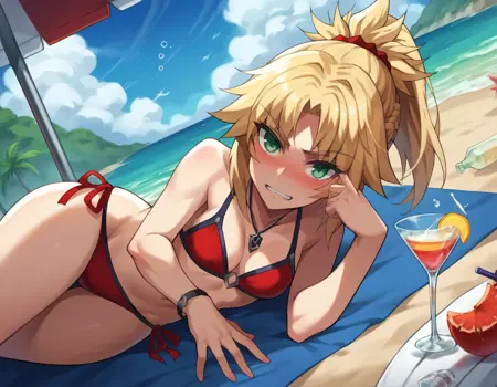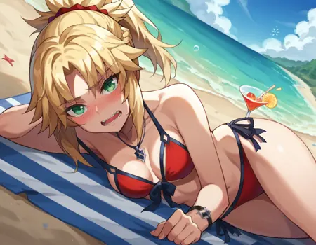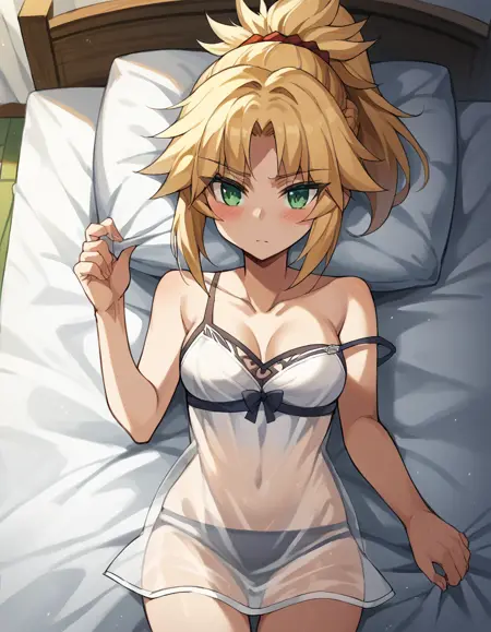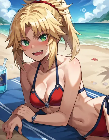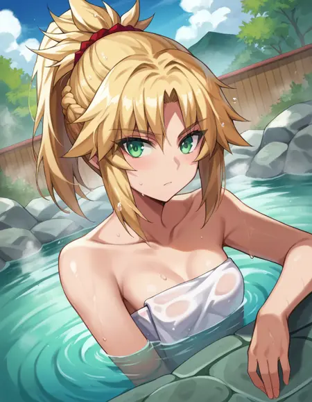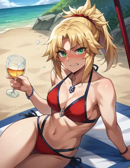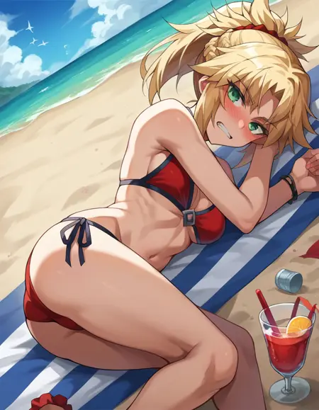 modred, green eyes, blonde hair, ponytail, short hair, scrunchie, red scrunchie, hair scrunchie,