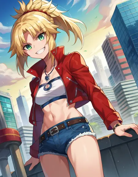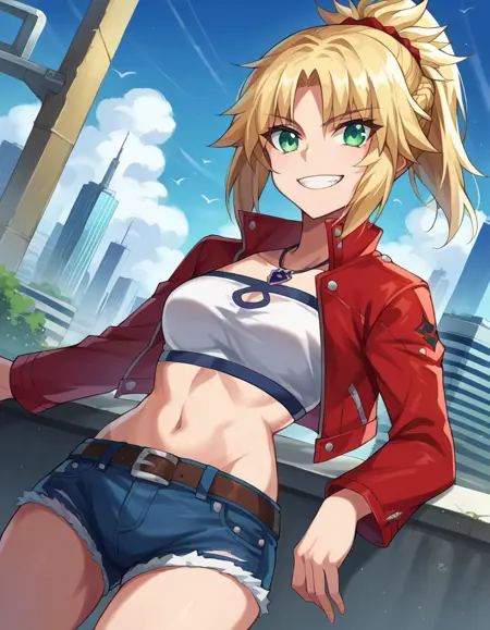 denim, denim shorts, jacket, jewelry, midriff, navel, necklace, red jacket, short shorts, shorts, tube top, white top,