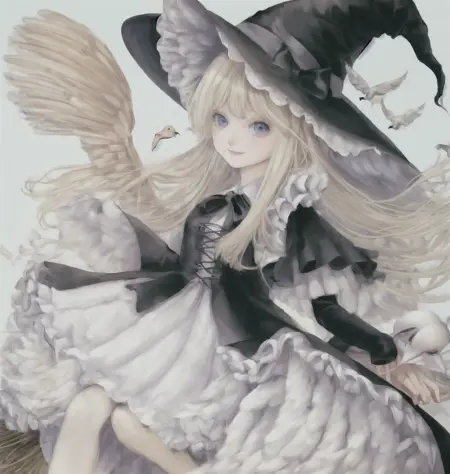 (1girl, 服饰改造, 蓝色蝴蝶结, 蓝色丝带, 书本, 靴子, 蝴蝶结, 月牙形, 连衣裙, 花边, 全身, 帽子, 帽子装饰, 手持, 手持书本, 长发, 长袖, 望向观众, 网帽, 佩 patchouli 知识, 丝带, 简单背景, 单人, 站立, 白色背景, 白猫,lora:yogisya_01:0.75)