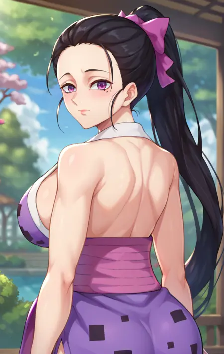 Promt: HinatsuruSDXL, 1girl, solo, long hair, looking at viewer, large breasts, black hair, cleavage, bare shoulders, purple eyes, collarbone, ponytail, japanese clothes, sleeveless, kimono, blurry, sash, garden, obi, sleeveless kimono, cowboy shot, mole under right eye,