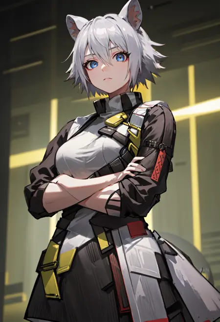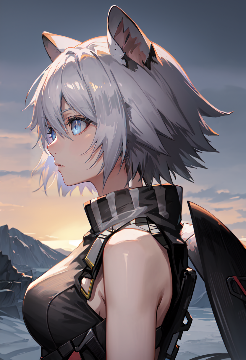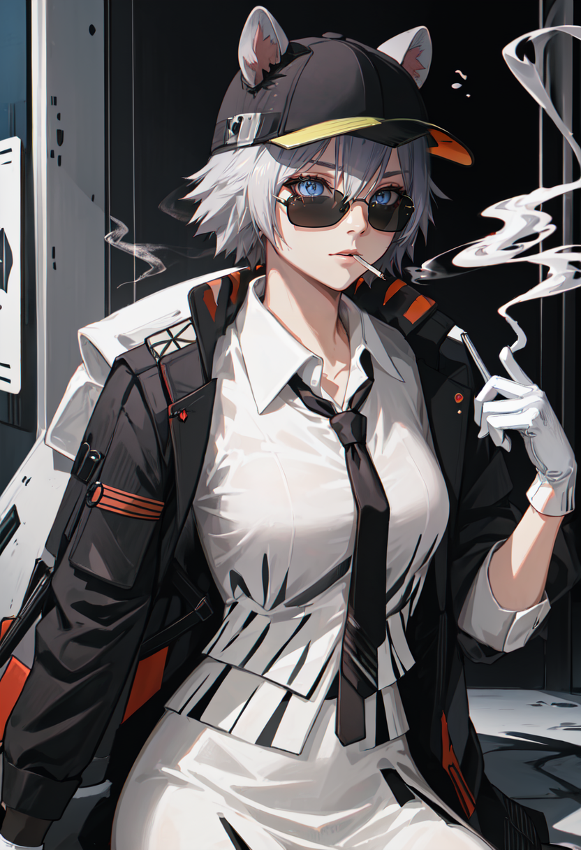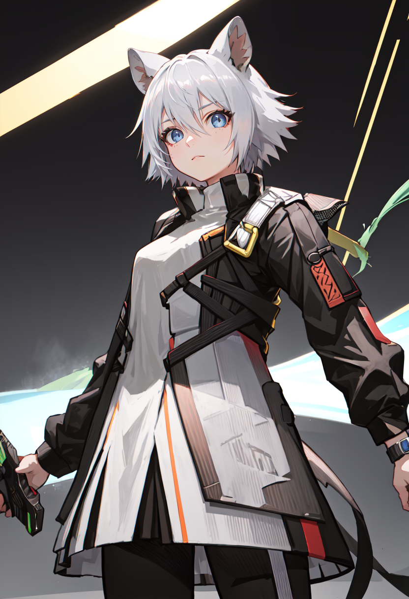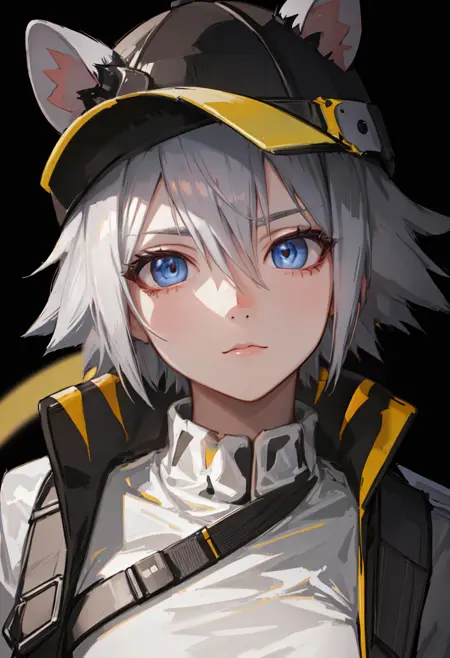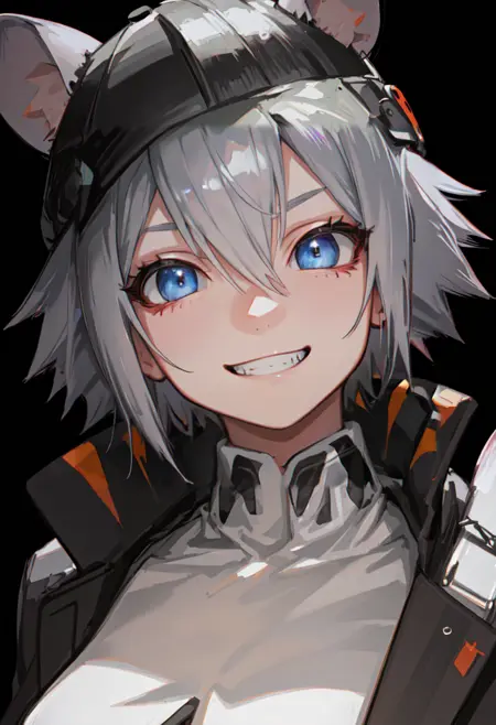 触发词为 click_arknights,修剪后的标签为 animal_ears, short_hair, mouse_ears, grey_hair, mouse_girl, black_headwear, hat, baseball_cap, blue_eyes, ears_through_headwear, tail, mouse_tail, hair_between_eyes。当某些特征(例如发色)有时不够稳定时,您可以将这些标签添加到您的提示词中。