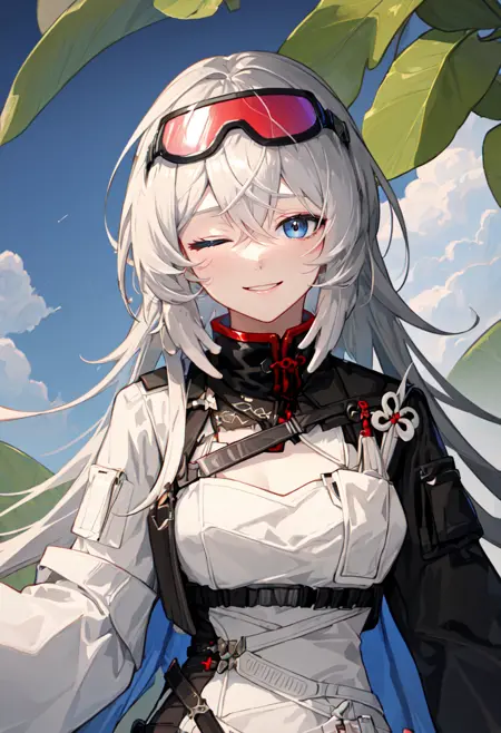 トリガーワードはmulberry_arknightsで、省略されたタグはlong_hair, grey_hair, blue_eyes, breasts, very_long_hair, goggles_on_head, hair_between_eyesです。ある特徴(例:髪の色)が一時的に安定しない場合、これらのタグをプロンプトに追加できます。