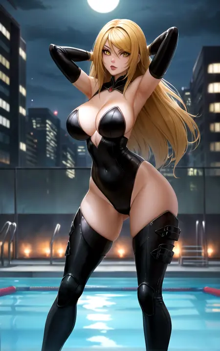|(contrapposto, arms behind head), neon_lights, cityscape, night, pool, full moon, outdoors, <lora:FAP_ARTSTYLE_Vampire_ownwaifu:0.9> , depth of field