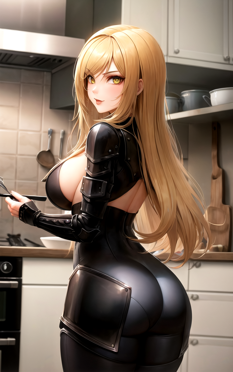 |(looking back, cowboy shot), from behind, cooking, frying pan, kitchen, indoors, <lora:FAP_ARTSTYLE_Vampire_ownwaifu:0.8> , depth of field