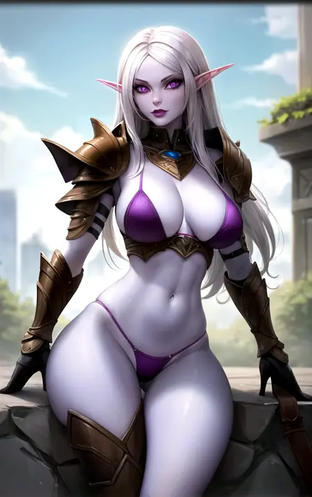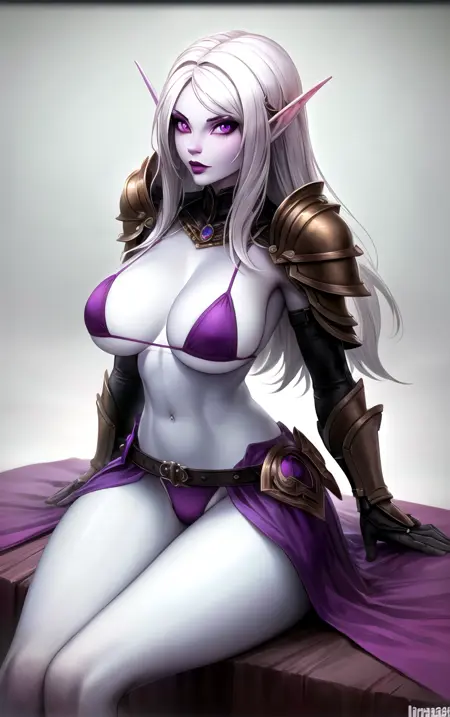 FAP_ARTSTYLE_Vampire_ownwaifu, 1girl, large breasts, long hair, colored skin, elf, purple eyes, blonde hair, very long hair, makeup, full armor,