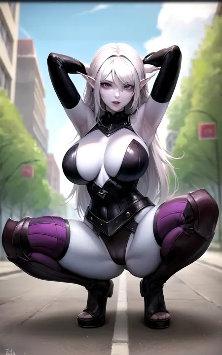 |(squatting, tiptoes, spread legs, arms behind head), full body, street, outdoors, <lora:FAP_ARTSTYLE_Vampire_ownwaifu:0.75> , depth of field