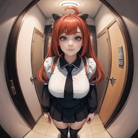 1girl, pov, peephole, looking at viewer, facing viewer, leaning forward, fisheye, solo,