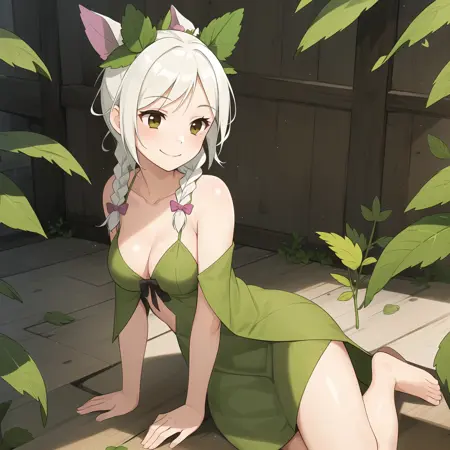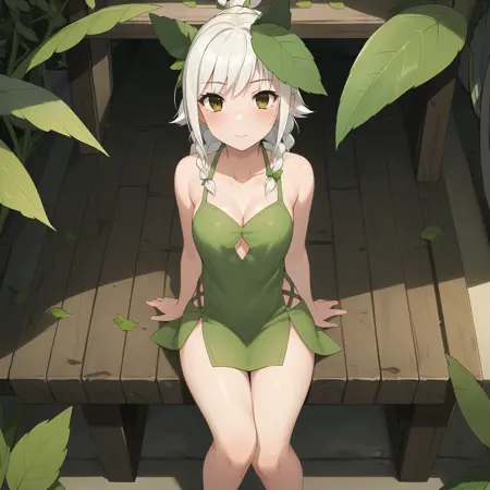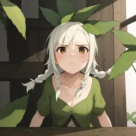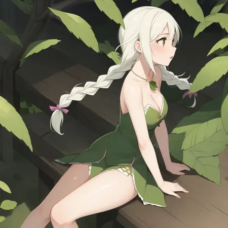 Helpful positives: twin braids, mint leaves, white hair, leaf dress, leaf, plant