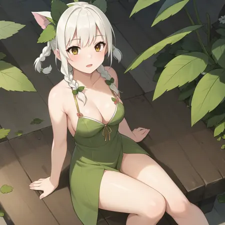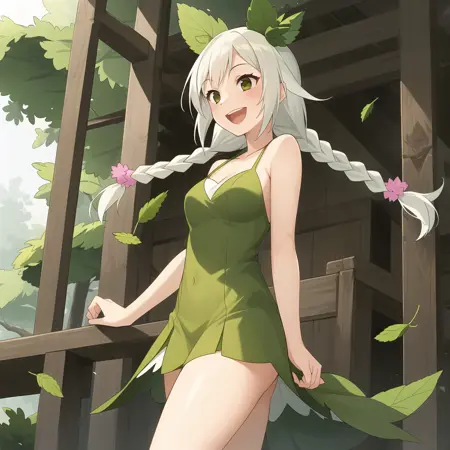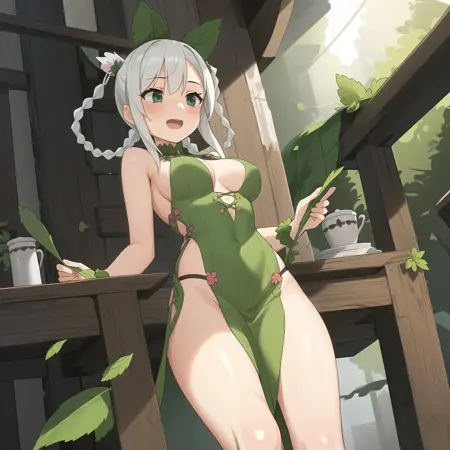 도움이 되는 긍정적 요소들: 이중 꼬리 머리카락, 민트 잎, 흰색 머리카락, 잎사귀 드레스, 잎사귀, 식물