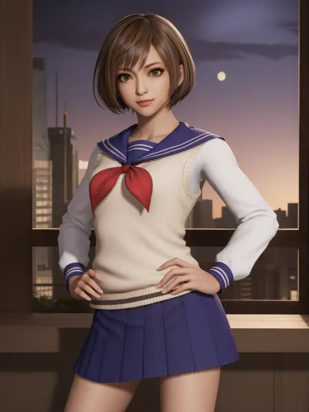 - ZSGWSsunshangxiangJK, 1girl, solo, school uniform, brown hair, short hair, serafuku, green eyes, pleated skirt, sweater vest, brown eyes, looking at viewer, cityscape, night, hand on hip,