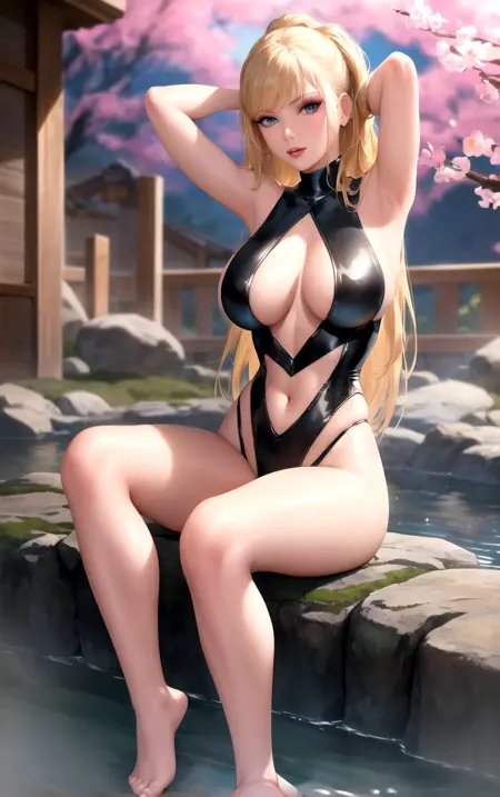 slingshot swimsuit, thighhighs, cleavage,