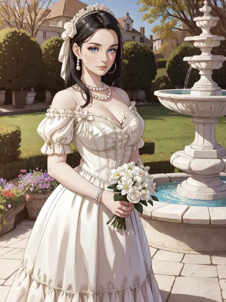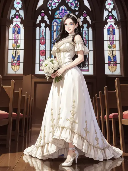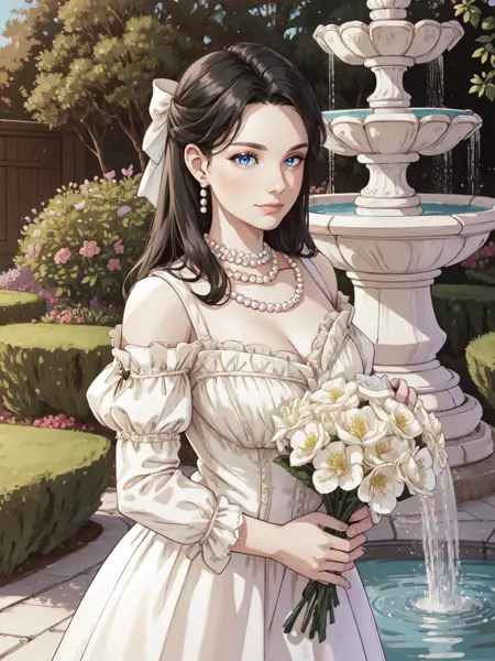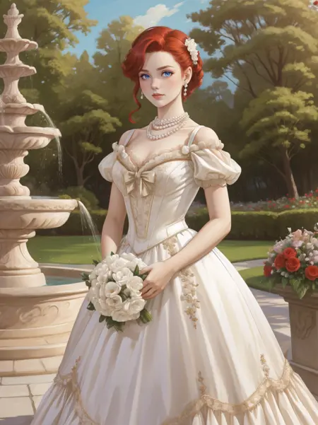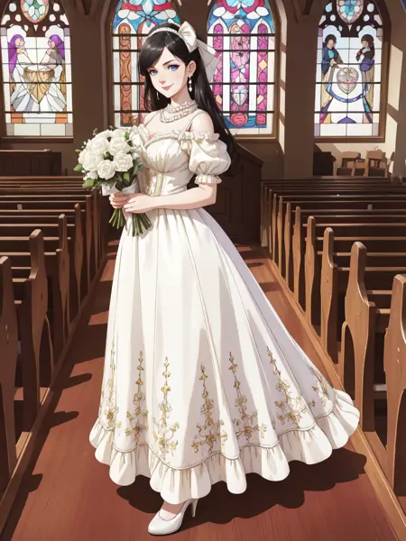 キーワード: HUD_Wht_Gwn、肩出し、エドワード朝のサテン白いドレス、ロングドレス、(ふっとした短い袖)、花、フィットした上着、真珠のネックレス、白いリボン、レースのアプリケーション、ハイヒール