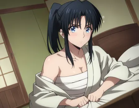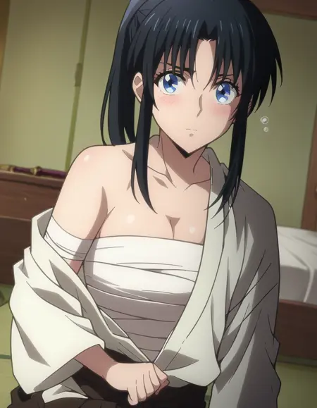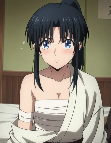 胸元, 日本の服, 開いた服, 着物, 包帯, 阪間, さらし, 開いた着物, 胸のさらし, はだとぬいどうさ, 木刀, ポニーテール,