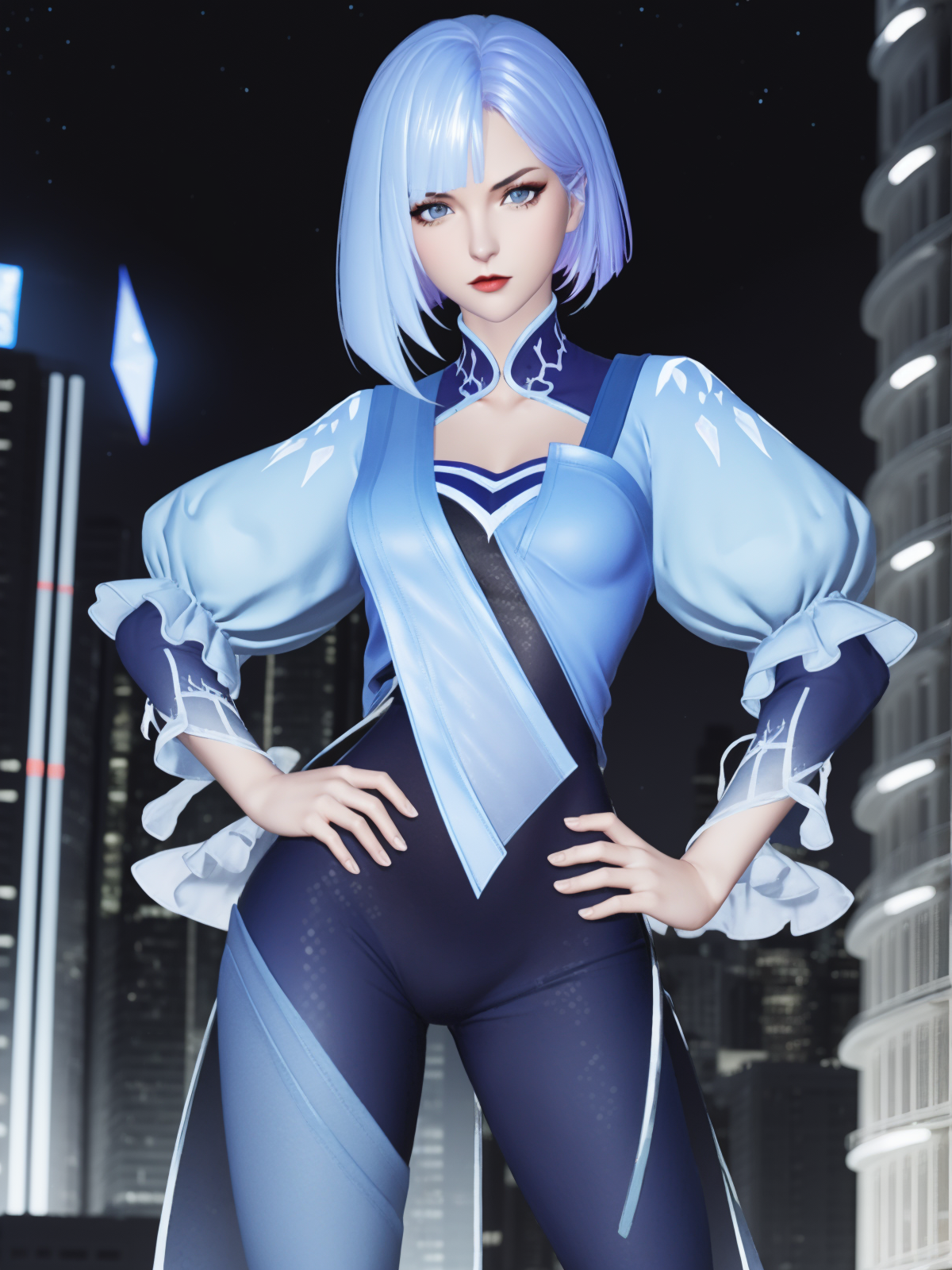 - WZRYjingBRHJ, 1girl, solo, blue hair, short hair, puffy sleeves, blue eyes, multicolored hair, looking at viewer, long sleeves, bodysuit, breasts, boots, cityscape, night, hand on hip,