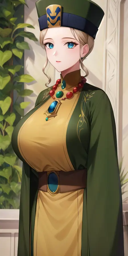 Yellow_turtleneck_robe_Green_sleeveless_coat_Green_hat_Neck_jewel_Bead_necklace_pendant_Wide_sleeves: 그녀의 공식 복장입니다. 가끔 서클릿을 모자 아래에 착용합니다.