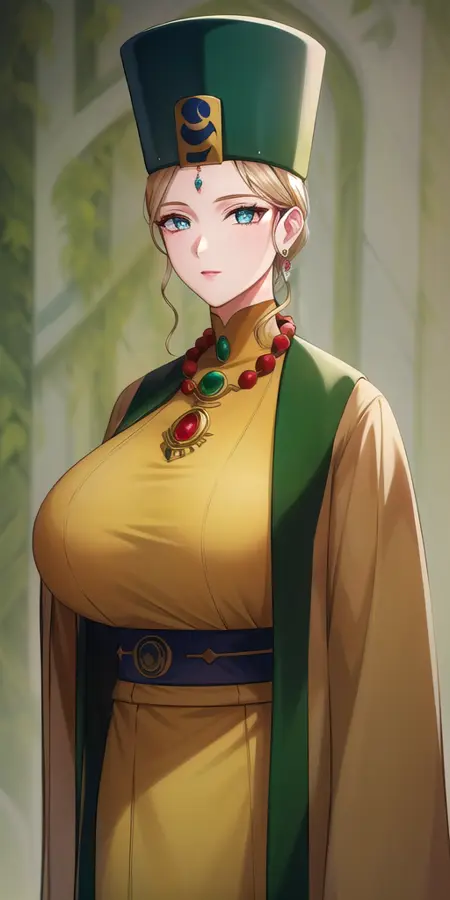 Yellow_turtleneck_robe_Green_sleeveless_coat_Green_hat_Neck_jewel_Bead_necklace_pendant_Wide_sleeves:彼女のフォーマルな衣装。サークレットを帽子の下に着用することもあります。