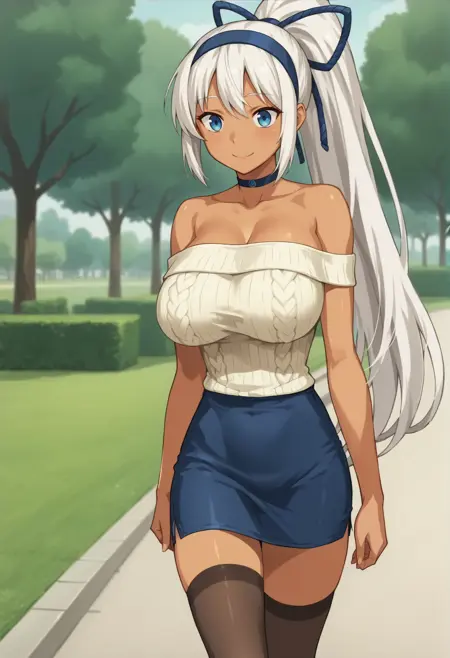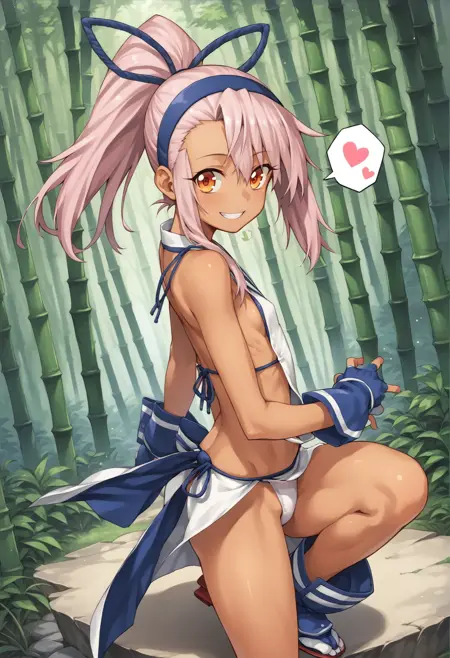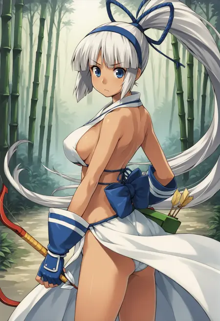 Notable tags: dark skin, white hair, long hair, high ponytail, hairband, hair ribbon, blue eyes, gloves, uneven gloves, fingerless gloves, underwear, tabi, panties, sideboob, showgirl skirt, sandals,