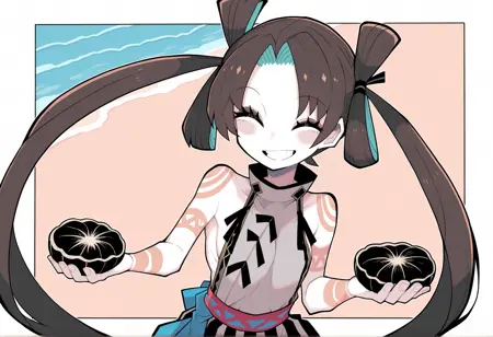 注目タグ:茶色の髪、非常に長い髪、ツインテール、分け目のある前髪、茶色の目、体の模様、顔の模様、灰色のドレス、背中が開いたドレス、サイドブック、裸の肩、帯、サンダル