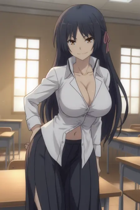 校服:["akio fudo, 棕色眼睛, 黑色头发, 长发, 姬发式, 头发丝带, 粉色丝带, 白色衬衫, 有领衬衫, 纽扣, 解开的衬衫, 肚脐, 黑色短裙, 百褶裙, 长裙, 侧开叉"]