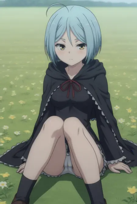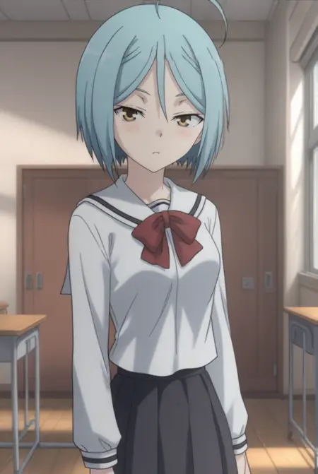 School Outfit: ["arin kannazuki, yellow eyes, blue hair, short hair, ahoge, school uniform, white shirt, black skirt, sailor collar, bowtie"]