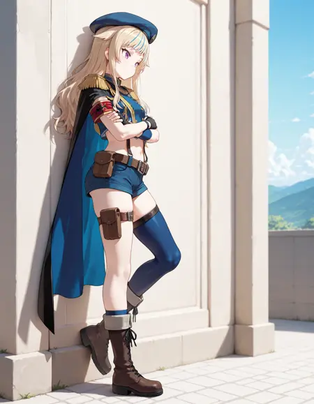 suzuki hina, 金发, 长发, 挑染发, 发帘, 紫色眼睛, 瘦弱, 小胸, 帽子, 贝雷帽, 蓝色过膝袜, 蓝色短上衣, 无指手套, 露腹, 单侧过膝袜, 无袖, 吊带短裤, 大腿绑带, 皮带, 包袋, 臂环, 腰带, 靴子