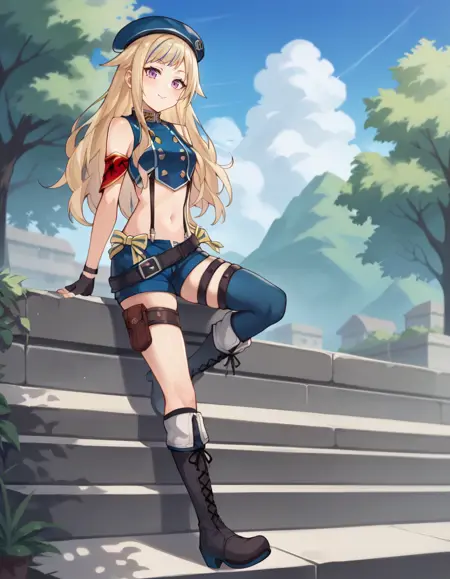 suzuki hina, 금발, 긴 머리, 스트라이프 머리, 머리 장식, 보라색 눈, 마른 체형, 작은 가슴, 모자, 베레모, 파란색 허벅지 양말, 파란색 크롭탑, 손가락 없음 장갑, 복부, 단일 허벅지 양말, 소매 없음, 스트랩 반바지, 허벅지 스트랩, 벨트, 파우치, 팔밴드, 스카프, 부츠