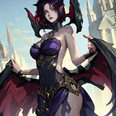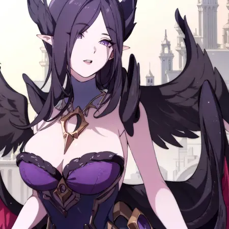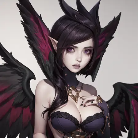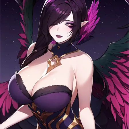 如果难以生成她所有特征,也请使用触发词 large_breast, eye_makeup, purple_wings!