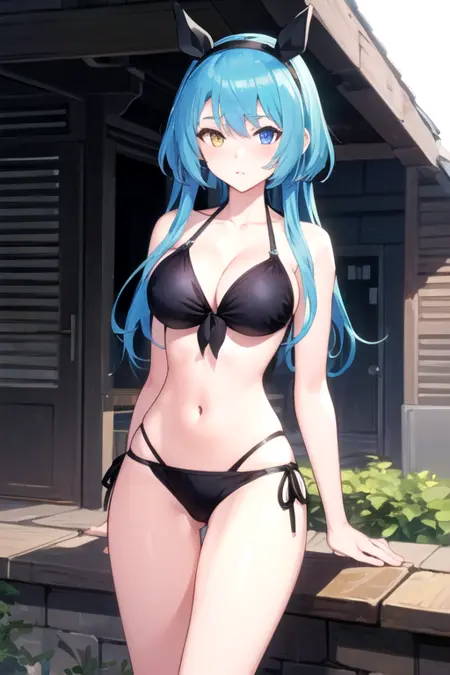 FuyuyuTsurugi, 1girl, solo, heterochromia, blue eyes, yellow eyes, large breasts, navel, fake animal ears, cleavage, blue hair, swimsuit, bikini, hairband, side-tie bikini bottom, short hair with long locks, black bikini,