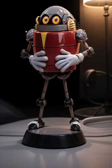 Eggrobo, robot, gray head, red shirt, jetpack, gray metallic limbs, holding gun, white gloves, black shoes with white straps