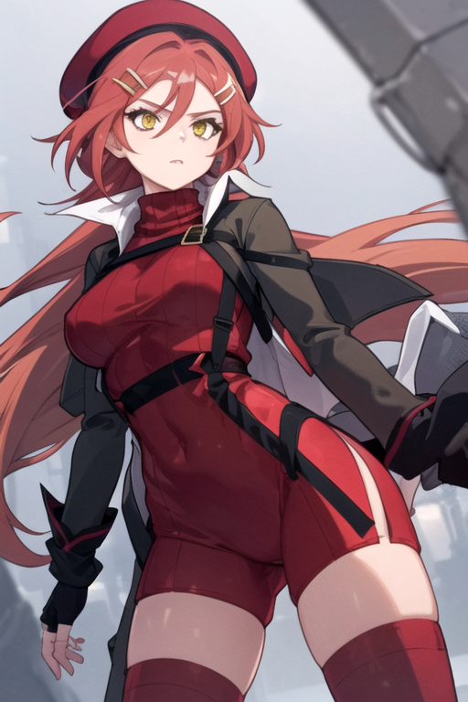 ShubNiggurath, 1girl, solo, very long hair, large breasts, hairclip, thighhighs, fingerless gloves, long sleeves, jacket, yellow eyes, red hair, beret, red gloves, ribbed sweater, turtleneck sweater, red sweater, black shorts,