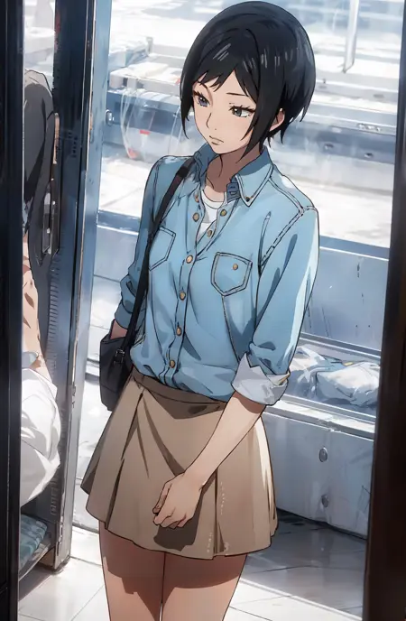 ロングヘア、シャツ、へそ、ホワイトシャツ、ポニーテール、ミドリフ、ショート、Tシャツ、結んだシャツ