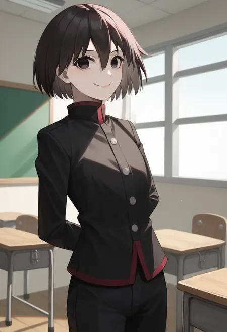 学监服: oshinogakuran, 苍白皮肤, 波波头, 空洞的眼神, 乃绪高中校服, 学监服, 黑色夹克, 长袖, 黑色手套, 黑色长裤