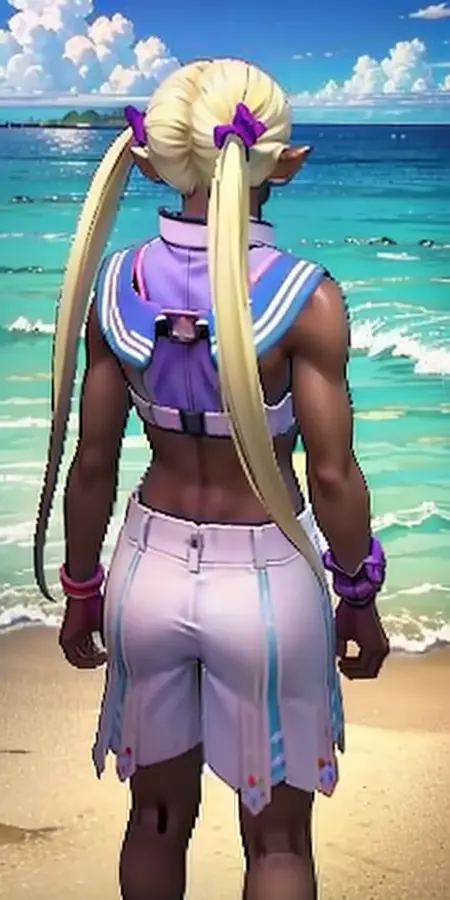 Laya, beastgirl, dark skin, pointy ears, blonde hair, twintails, purple hairclips, green eyes, arm tattoo, bare shoulders, purple fingerless gloves, collared top, top cutout, sleeveless open robe, cross clasp, midriff, navel, wide pants, double belt, shoes