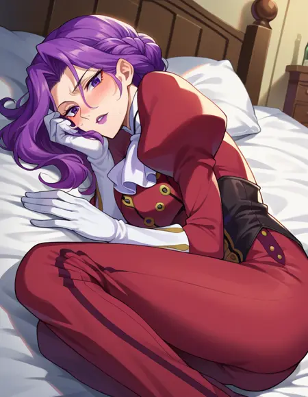アスコット、手袋、ジュリエットスリーブ、リップストック、ロングスリーブ、メイク、パンツ、ふくらはぎスリーブ、パープルの唇、レッドのパンツ、レッドのシャツ、シャツ、ホワイトアスコット、ホワイト手袋、
