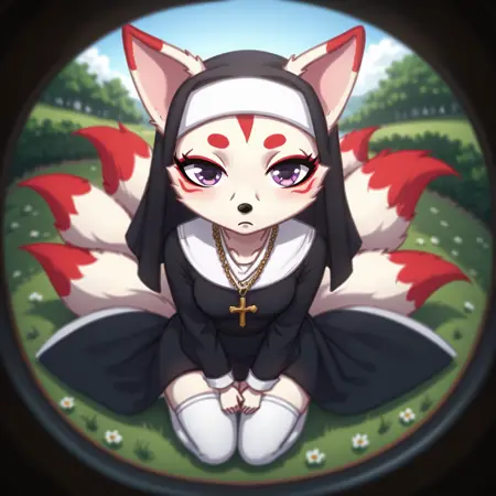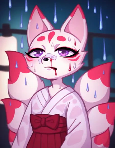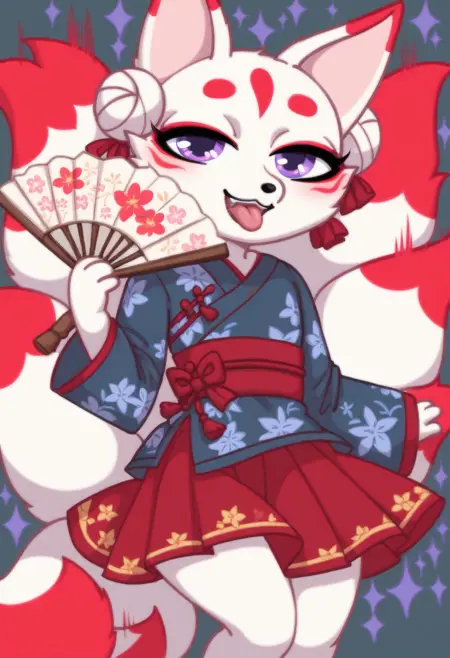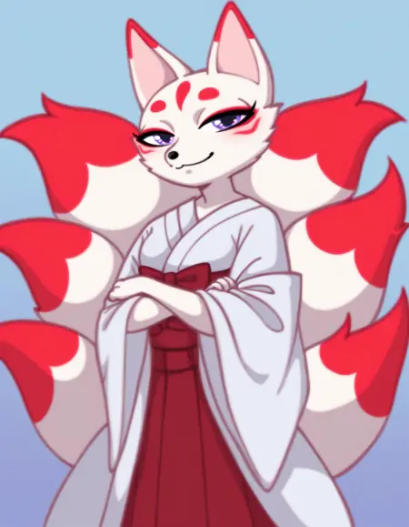 Promt: Kumiko, white fur, purple eyes, kitsune, 5 tail, white kimono, red skirt, red belt.