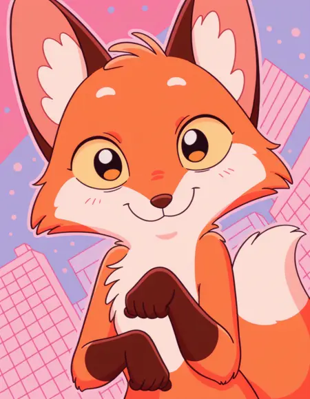 提示词: pappy, 橘色毛发, 狐狸, 棕色鼻子, 黄色眼白, 尾巴。
