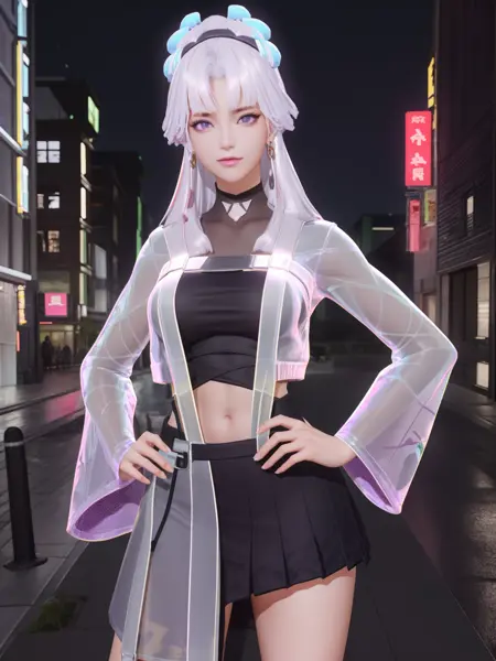 - WZRYshangguanwanerTLHMZ, 1girl, solo, skirt, navel, see-through, looking at viewer, bangs, purple eyes, jacket, midriff, socks, breasts, long hair, white hair, crop top, see-through sleeves, hair ornament, sneakers, cityscape, night, hand on hip,