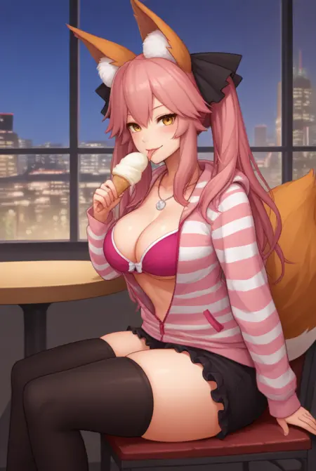 tamamo spring, 粉色头发, 长发, 双马尾, 动物耳朵, 狐耳, 毛茸茸的耳朵, 狐尾, 发丝带, 开放式服装, 条纹连帽衫, 帽子, 粉色连帽衫, 袖子超过手腕, 荷叶边短裤, 黑色短裤, 黑色过膝袜, 内衣, 粉色胸衣, 项链, 饰品