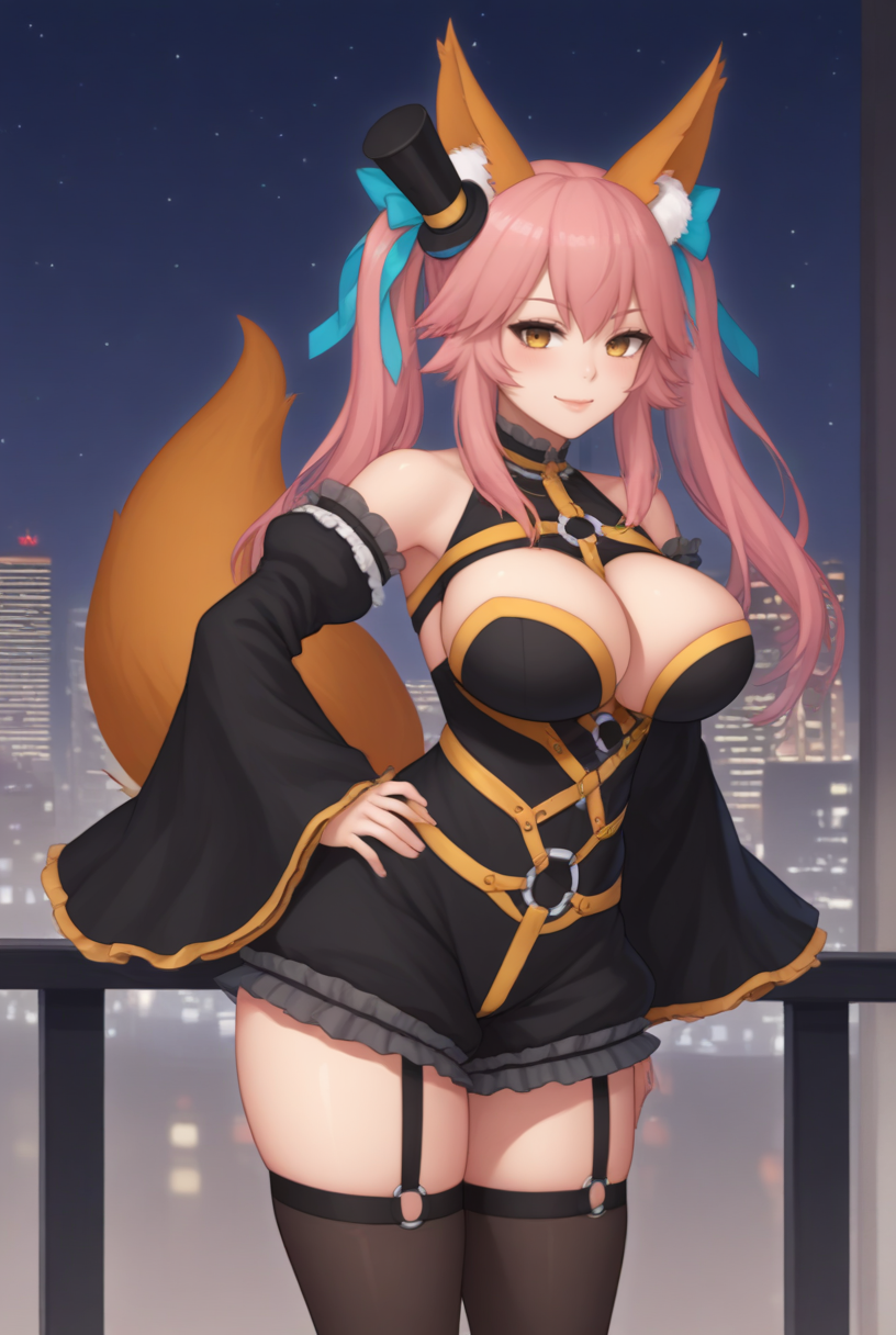 tamamo sable, 粉色头发, 长发, 双马尾, 动物耳朵, 狐耳, 毛茸茸的耳朵, 狐尾, 发饰蝴蝶结, 发丝带, 青色丝带, 迷你礼帽, 黑色头饰, 黑色连衣裙, 花边, 分离袖子, 宽袖, 胸部开叉, 黑色过膝袜, 露肩, 肩带, O型环