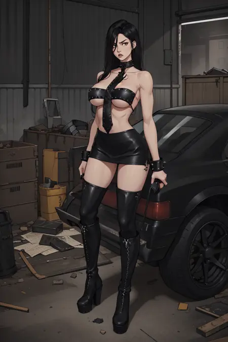 关键词:hud_crss_ttop,无肩带,黑色尖刺十字形无袖背心,皮裙,项圈,腕带,及膝靴,黑色指甲,下胸露,侧胸露