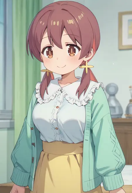 (miyo-casual:1.1),murosaki miyo,棕色眼睛,红发,低双马尾,白色花边衬衫,敞开的绿色开衫,黄色短裙