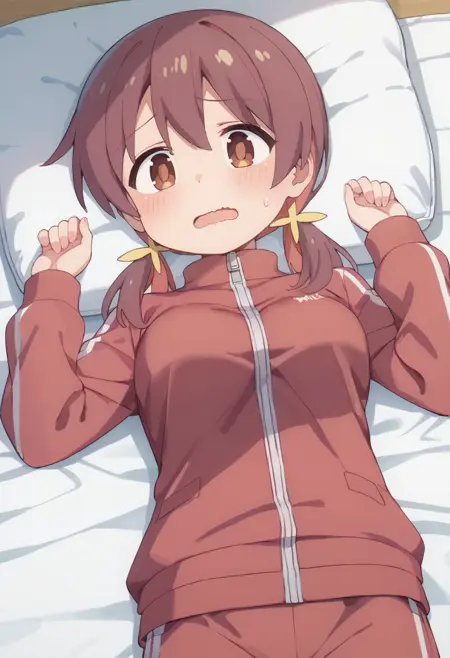 miyo-gym,murosaki miyo,棕色眼睛,红发,低双马尾,红色运动夹克,红色运动裤