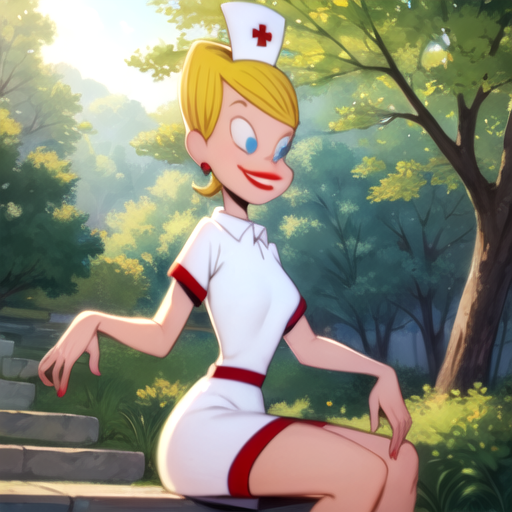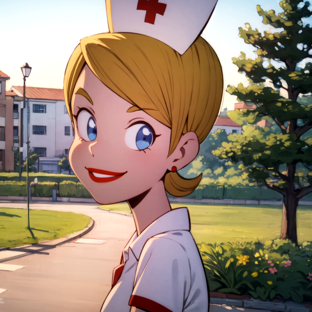 一般的なプロンプト:Loulabelle、1girl、笑顔、ショートヘア、青い目、金髪、帽子、ドレス、化粧、リップスティック、看護師帽、赤い唇、看護師