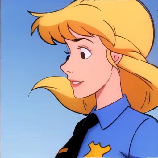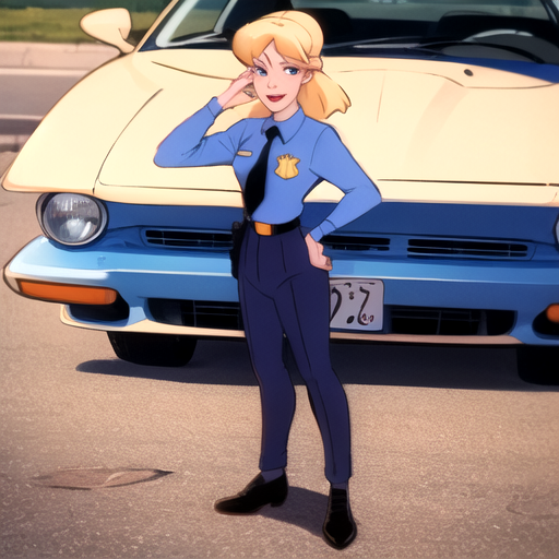 일반 프롬프트: 미란다 라이트, 1girl, 긴 머리, 미소, 금발, 셔츠, 넥타이, 칼라 셔츠, 벨트, 바지, 유니폼, 검은 눈, 파란 셔츠, 검은 넥타이, 파란 바지, 경찰, 경찰 유니폼, 여경